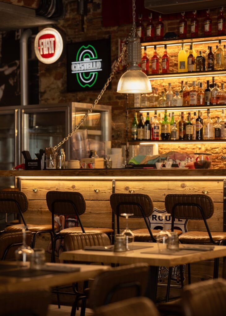 Mangiare da noi significa sedersi circondati da auto e moto d’epoca, in un’ambientazione ispirata ai garage vintage.
